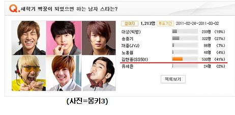 Music website Monkey 3 from 24 Feb to 2 Mar for a duration of 7 days, targeted at 1231 person and did a survey with the theme ”The Male Star that you wanted to spend new school term with’. The poll return with result Kim Hyun Joong at 41% (500 votes) high score and got Number 1.